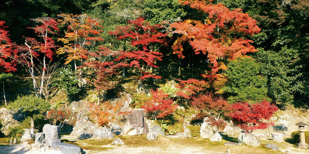 永興寺(ようこうじ)の裏庭には、室町時代に夢窓国師が作ったとされる枯山水庭園があります。後醍醐天皇、足利尊氏の帰依により、京都に天龍寺を開いた夢窓国師は、全国に名庭園を作った禅庭の創始者としても知られています。城山を借景とした庭園は、自然の岩肌を枯れ滝に見立て、鯉の滝登りを表現した石組みなど、巧みな作庭技術が随所に見られ、現在では岩国市指定文化財(名勝)となっています。