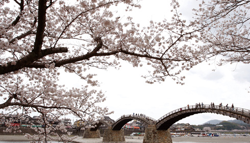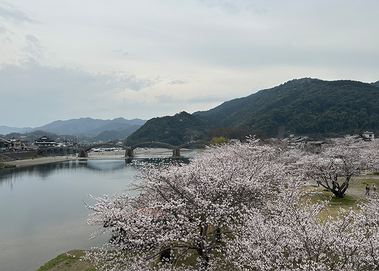 永興寺(ようこうじ)からゆっくり歩いて数分の場所に、日本三名橋に数えられる錦帯橋があります。春は桜、秋は紅葉の名所として、全国から多くの人が訪れる観光スポットです。五連のアーチからなる錦帯橋は、継手と仕口という日本古来の木組み工法の技が生かされており、歴史的にも価値の高い橋と言われています。
